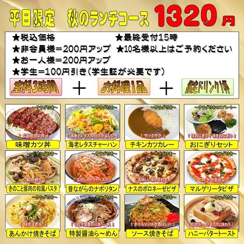 会員価格:平日1650円 内容:受付時間11:00~15:00 ルーム料金3時間無料+12種類の中からメイン料理1品+1ドリンク付き 別料金で限定ソフト飲み放題。 繁忙期には行っていない場合がございますのでお問い合わせください。