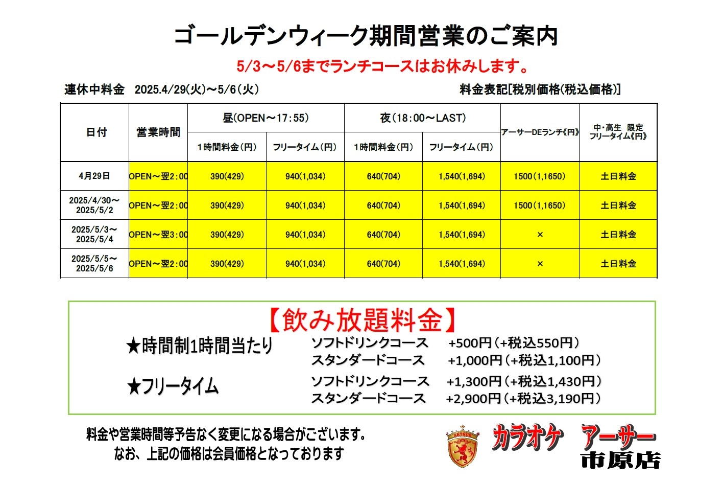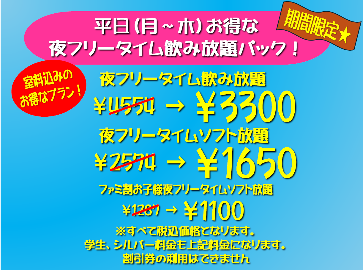 ※ご家族でご利用の場合、小学生・中学生・高校生は室料・飲み放題を大人の半額料金でご利用いただけます。(会員限定ファミ割)