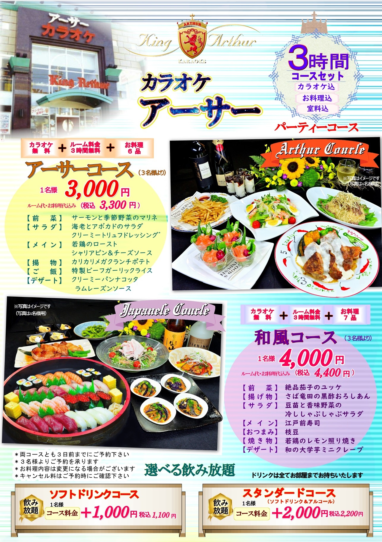 忘年会の予約にぴったりのコース料理プラン♪ カラオケと美味しい宴会料理でこの春の宴会を楽しんで下さい 完全予約制 ルーム料金3時間+料理(お1人様料金) 和風コース 4000円(税込4400円) アーサーコース 3000円(税込4400円) 各種別途飲み放題お付けできます。