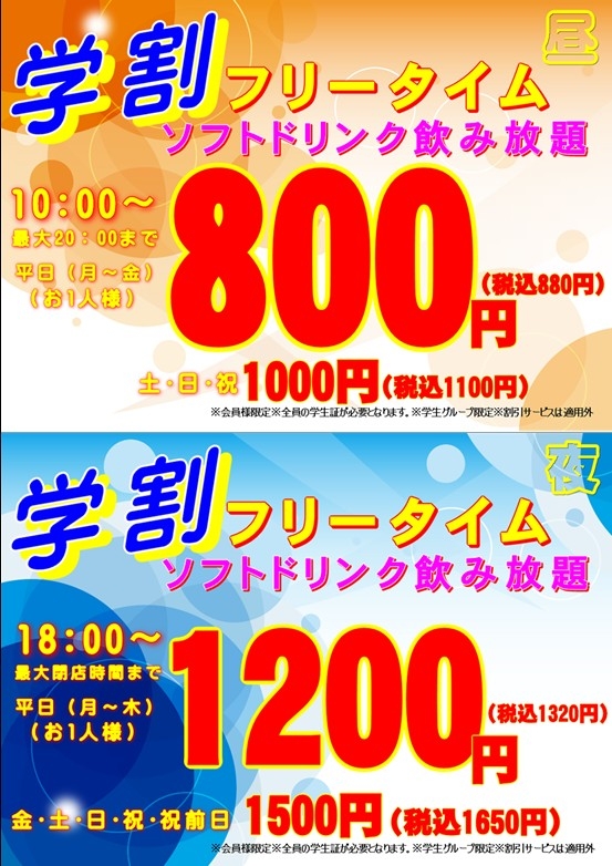 ※昼のフリータイムの受付は18時までですが、フリータイム自体は20時までご利用いただけます。