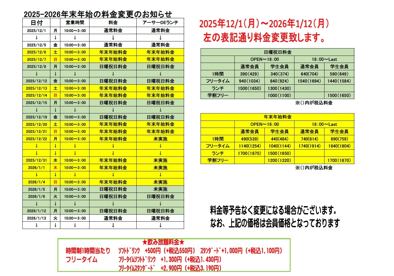 年末年始料金変更のお知らせ