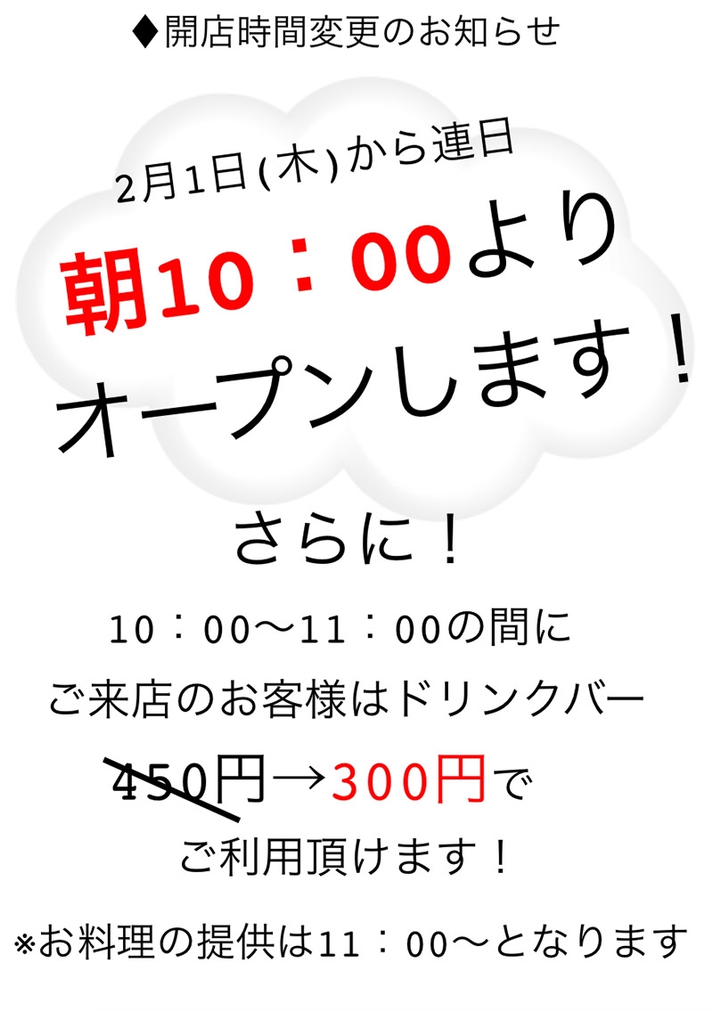 朝10:00よりオープン!さらに、10時〜11時の間、ドリンクバー通常450円が300円でご利用いただけます!