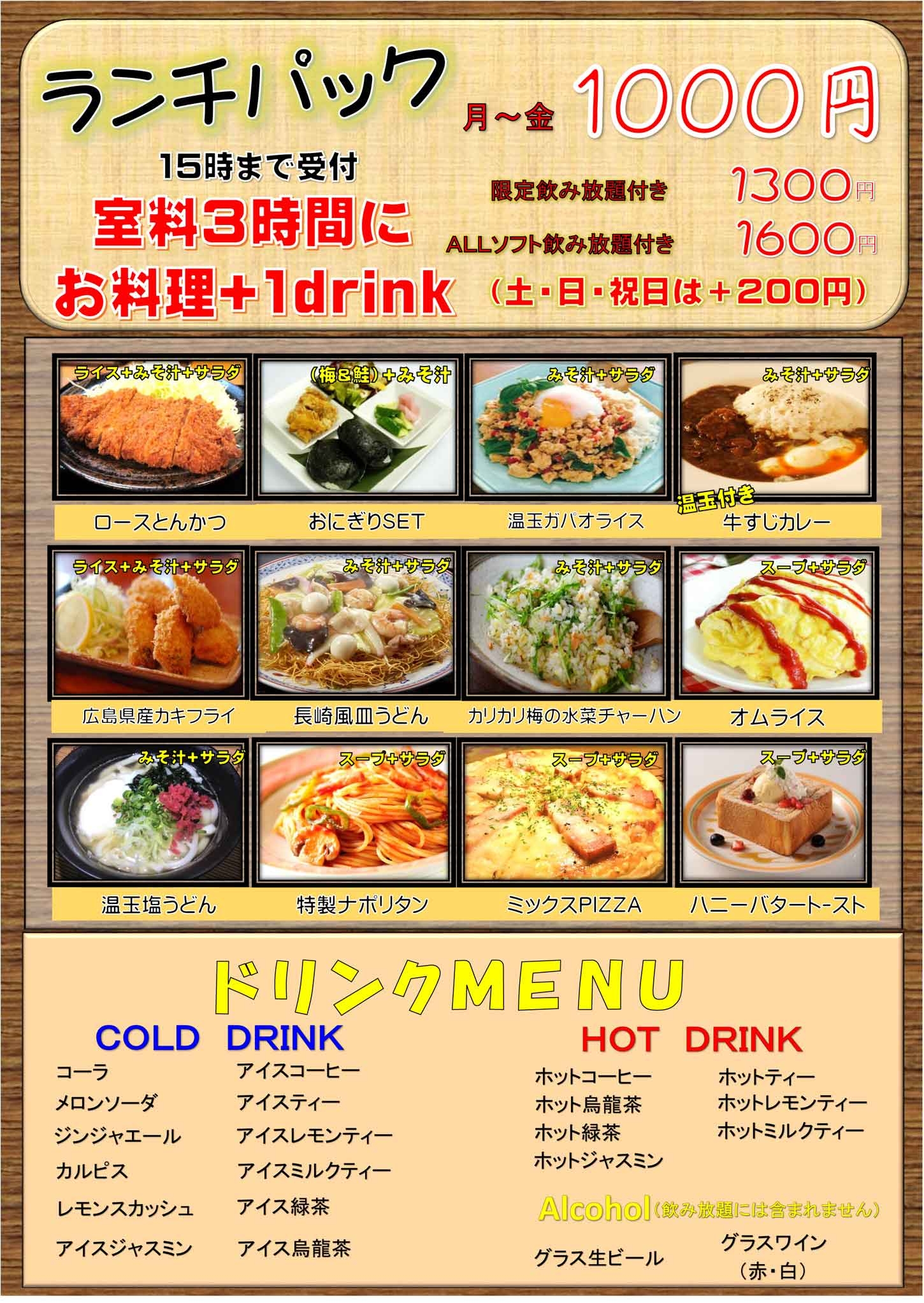 室料3時間にお料理+1ドリンク付きのお得なランチパック!