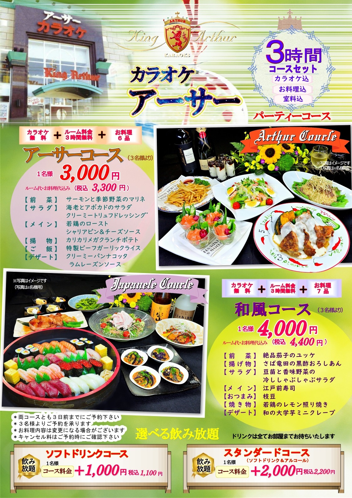 カラオケ個室3時間+和風コース全7品、アーサーコース全6品!