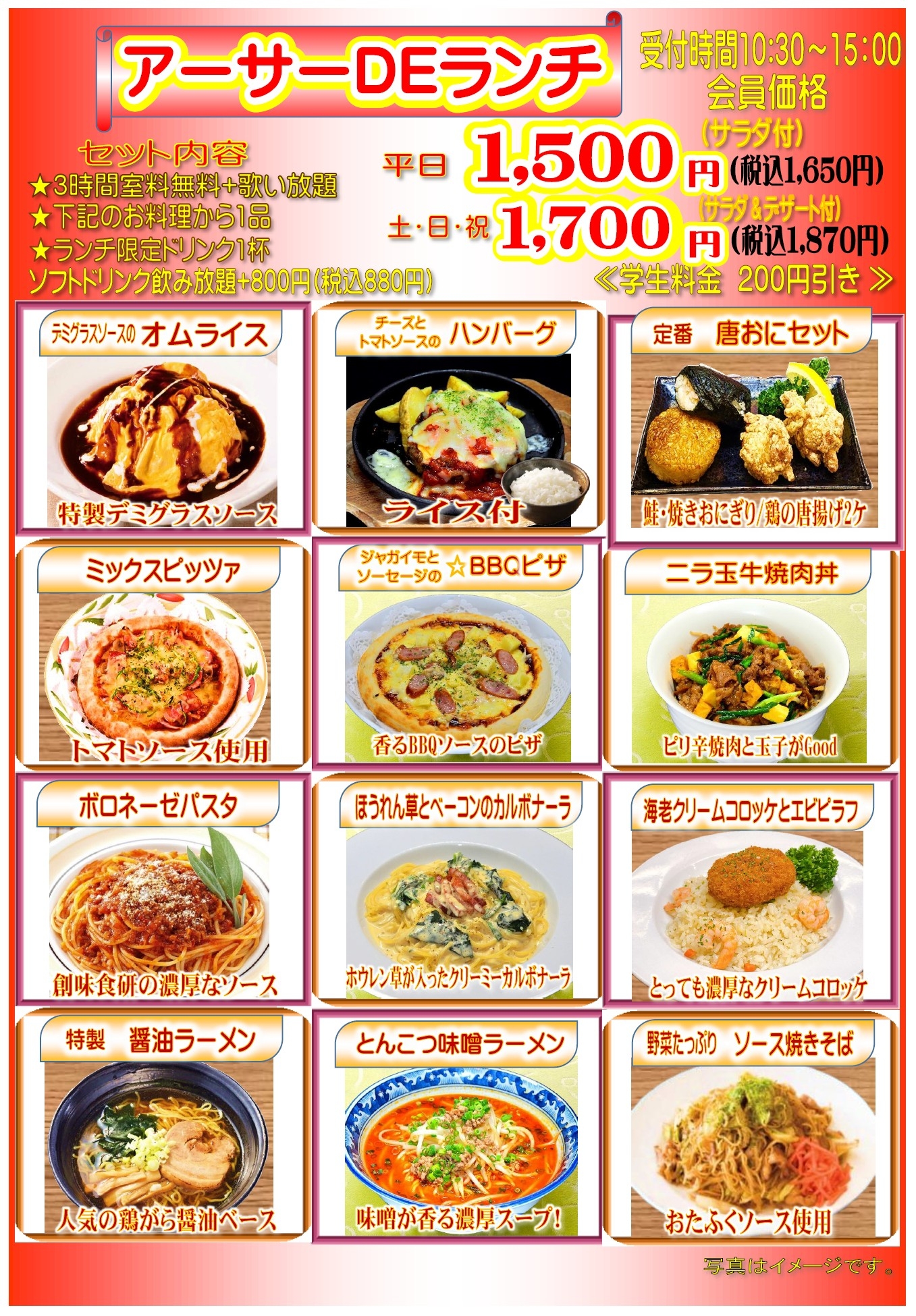 セット内容 ・3時間ルーム料金無料 ・12種の料理から1品 ・指定ドリンク1杯付 ・ランチ受付時間10:30~15:00 ・+880円でソフトドリンク飲み放題
