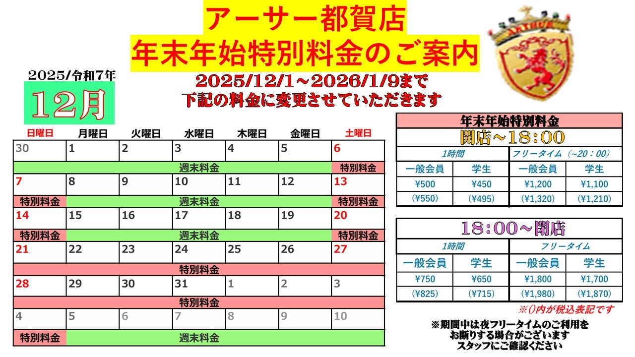 12/1より年末料金として室料変更のお知らせ。 営業時間の確認などお電話にて対応しております。